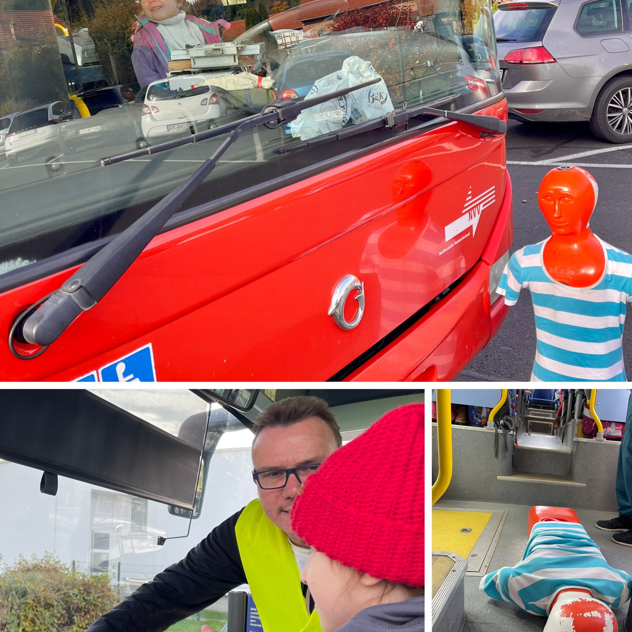 Jedes Kind durfte sich dann sogar mal auf den Platz des Busfahrers setzen, um zu verstehen, was der „tote Winkel“ bedeutet. Dazu wurde extra ein Dummy an eine gefährliche Stelle vorm Fahrzeug platziert. Genau der flog bei der folgenden Spritztour aufgrund einer Vollbremsung bei Tempo 25 km/h eindrucksvoll durch den Gang des Busses.