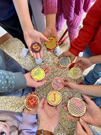 Zudem wurden Holzschlüsselanhänger bestickt. Dabei konnte jedes Kind entscheiden, ob es einen Anhänger mit dem Anfangsbuchstaben oder einem freien Motiv besticken möchte. Dieses Mal haben wir Kreuz- und Rückstiche verwendet.