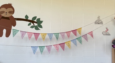 In der Häkel- und Stick-AG von Frau Kraus wurde zur Dekoration der Grundschule für verschiedene Anlässe eine schöne Wimpelkette bestickt. Dazu wurden die einzelnen Buchstaben mit Rückstichen auf die Wimpel bestickt.