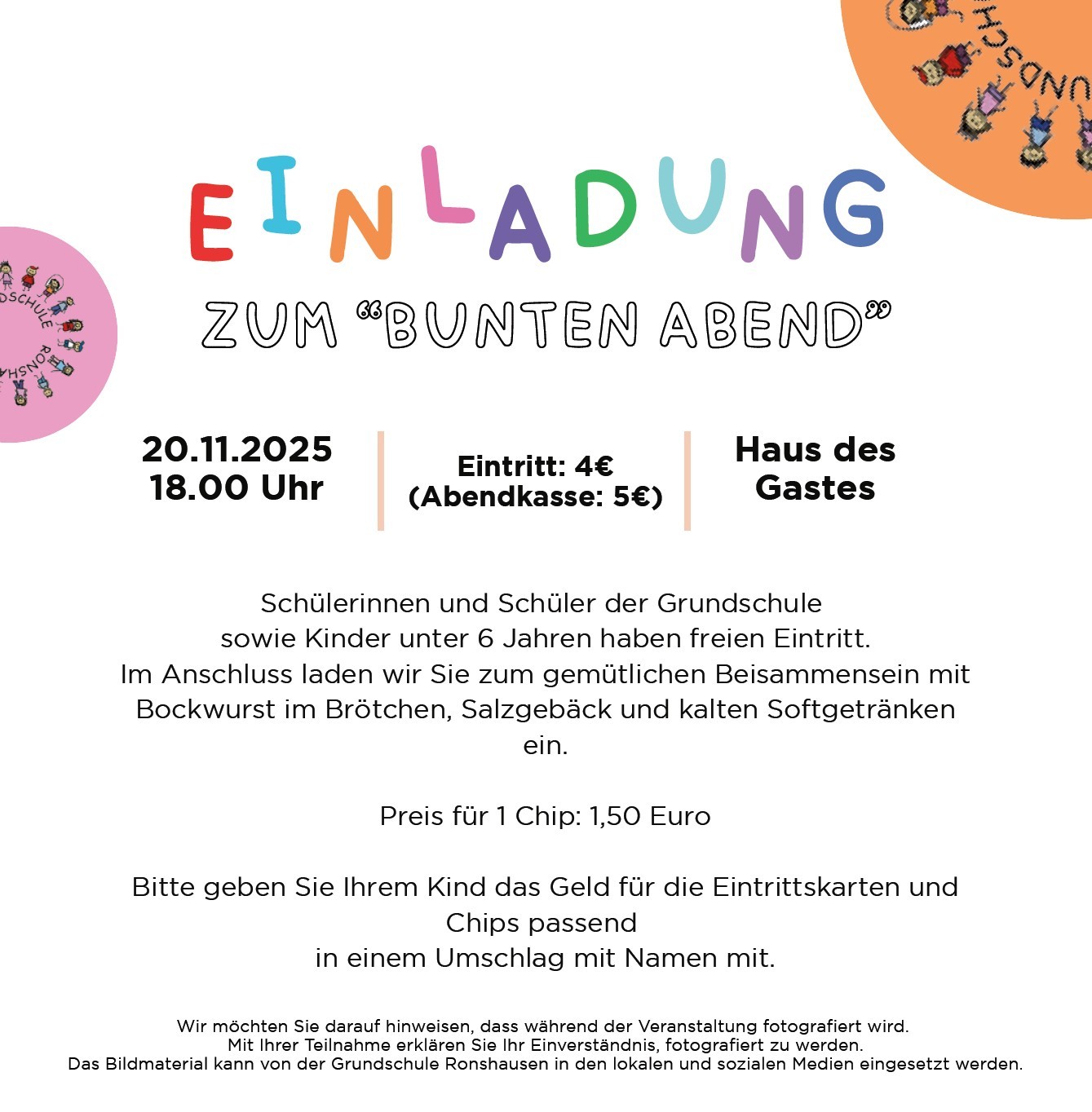 - Bitte geben Sie Ihrem Kind „Hausschuhe” mit, die in der Schule bleiben. Das können Sandalen, Turnschläppchen usw. sein.